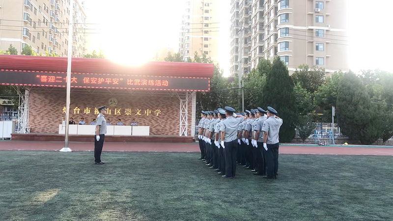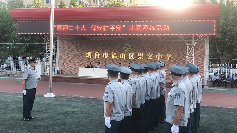 为进一步加强保安队伍正规化建设,树立良好的社会形象,努力打造一支素质高、纪律严、业务熟、形象好、作风硬、服务专、群众满意的保安队伍。近日,98彩票根据市公安局、福山分局的统一部署,组织、开展了以“喜迎二十大 保安护平安”为主题的岗位练兵活动。并组织保安员代表参加了 9月28日下午在福山区崇文中学操场举行的“喜迎二十大 保安护平安”比武演练活动。