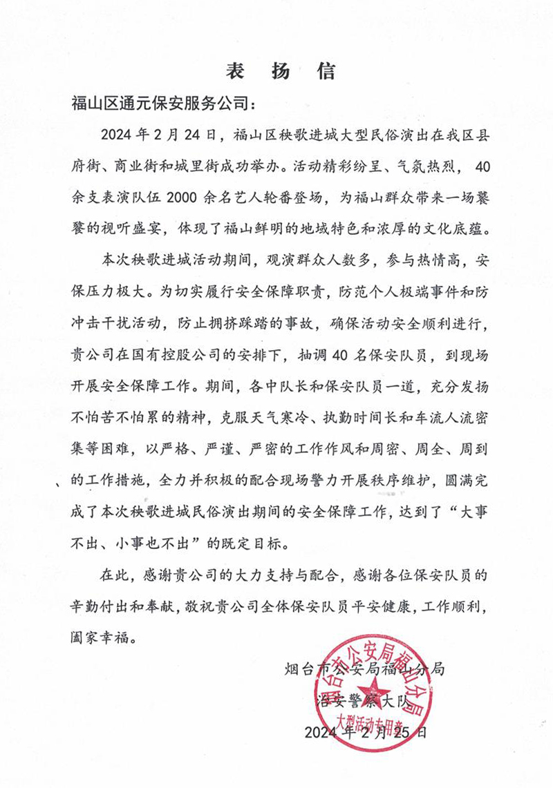 烟台通元顺利完成福山区元宵节大型民俗表演活动——“秧歌进城”安保工作